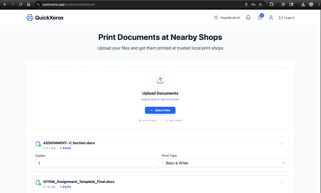 QuickXerox is a modern solution that simplifies the document printing process. Users can upload their documents, configure preferences like color or B&W, and select a nearby shop for pickup. The platform handles secure online payments and provides shopkeepers with a dedicated dashboard to manage and fulfill orders efficiently.